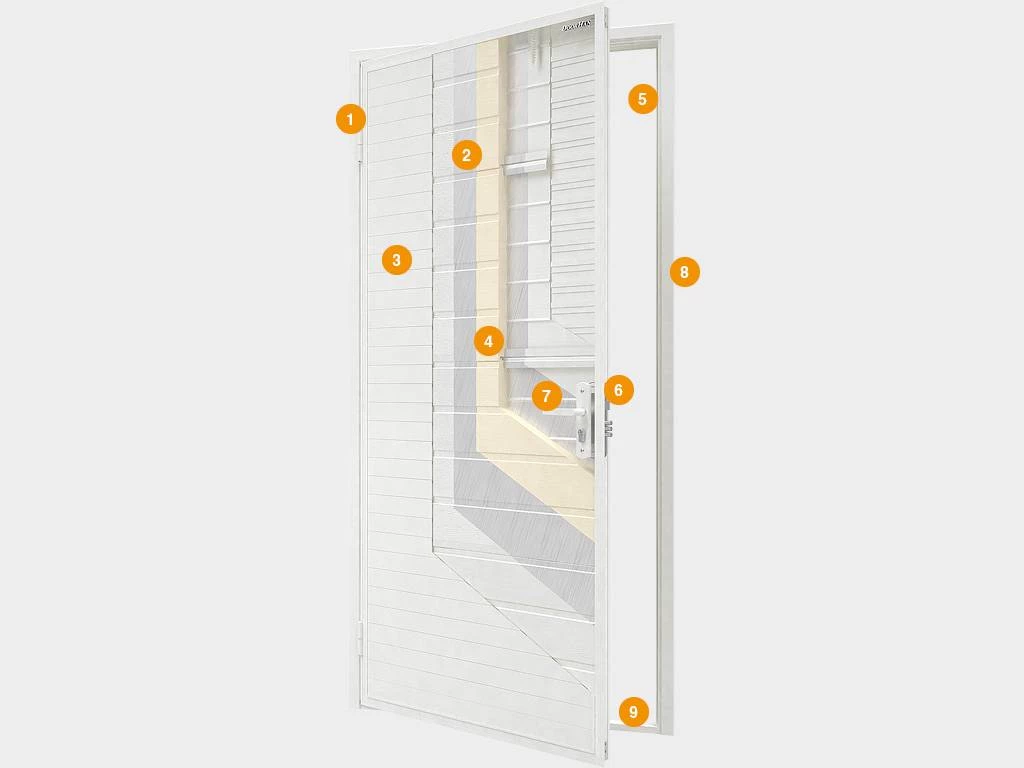 Поверхность покрыта специальным антикоррозийным порошком. Двойной контур ТЭП уплотнителя не пропускает в помещение холод и оберегает от посторонних шумов. С наружной стороны дверь выполнена в дизайне «доска» и имеет структуру поверхности «под дерево», с внутренней — «гофра» с текстурой «стукко». Помимо стандартного белого цвета у представленной модели есть еще два цветовых решения – коричневый и красно-коричневый. Возможно индивидуальное окрашивание (в рамках палитры RAL).